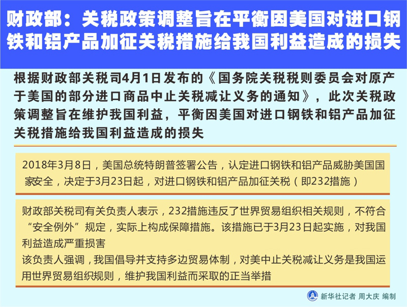 图表:财政部:关税政策调整旨在平衡因美国对进口钢铁和铝产品加征关税措施给我国利益造成的损失