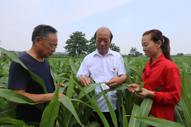 阴银录担任胡张乡王村党支部书记20年来,始终坚持党建引领农村各项工作,带领村民发展建起千亩良田基地,千亩油桃基地,千亩苹果基地,千亩设施大棚蔬菜基地,同时利用集体农场资源向外发包,每年为村集体增加收入5万余元。全村大街小巷实现了硬化、亮化、绿化、美化,成为远近闻名的新农村建设示范村。图为运城市优秀共产党员、胡张乡王村党支部书记阴银录正在和村民查看玉米病虫害防治情况。