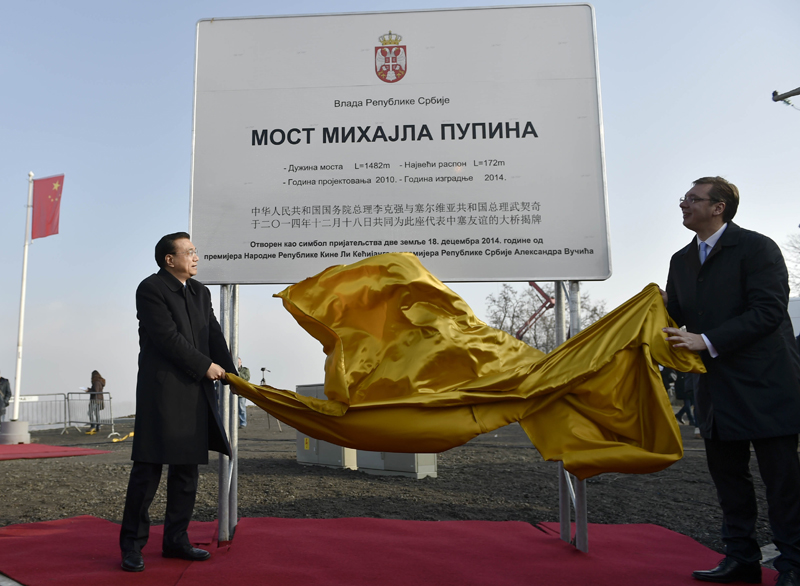 图为当地时间2014年12月18日,李克强总理在塞尔维亚出席贝尔格莱德跨多瑙河大桥竣工仪式。